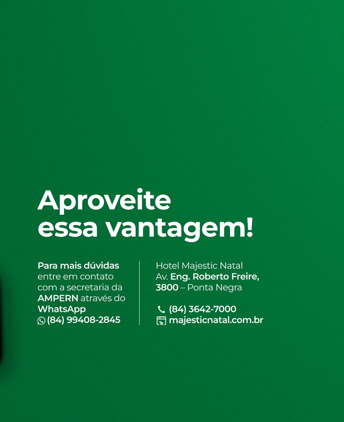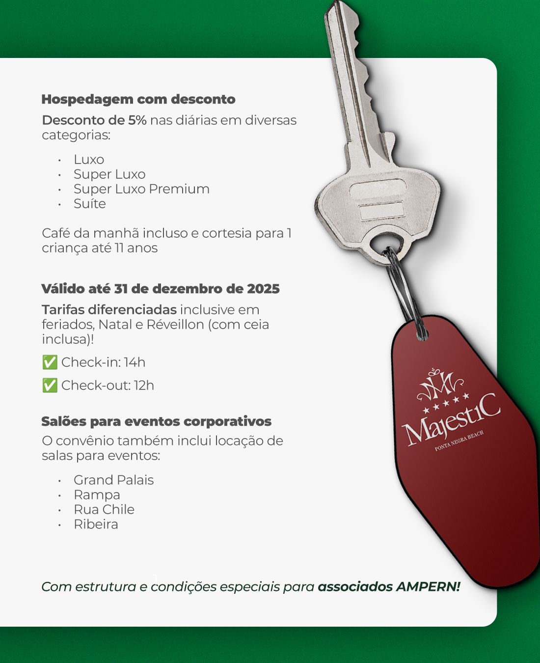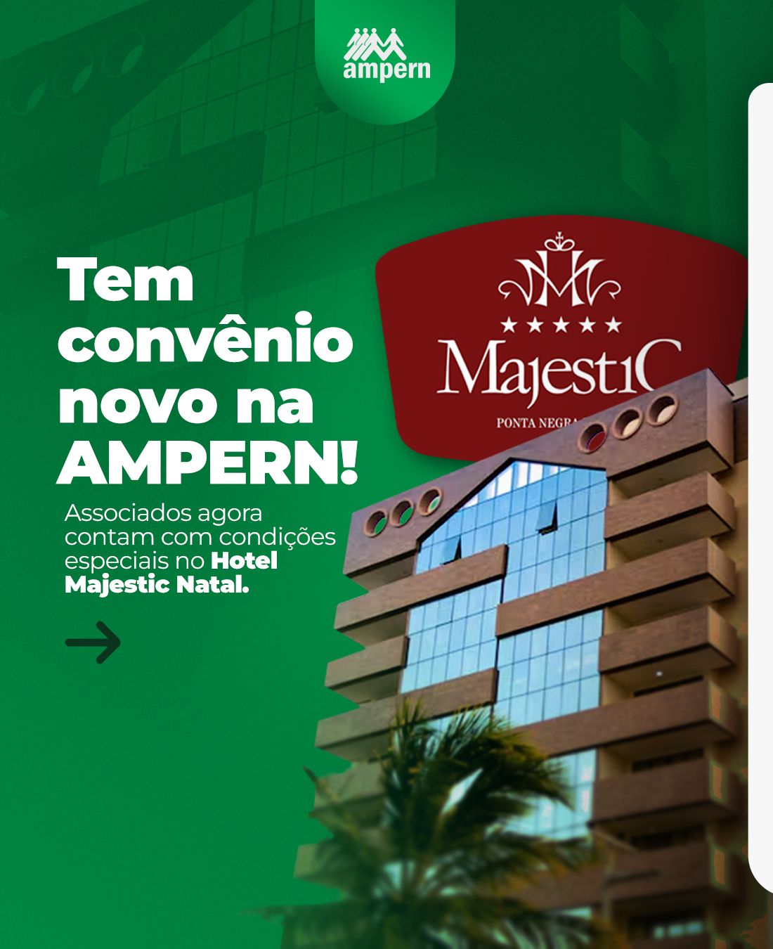 Associados AMPERN agora têm descontos e vantagens em hospedagens ou contratação de serviços no Hotel Majestic, em Ponta Negra. Após convênio firmado com a associação, o hotel vai oferecer descontos de 5% nas diversas modalidades de estadia, incluindo café da manhã e cortesia para uma criança até 11 anos.