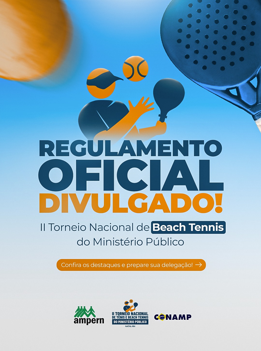 A Associação do Ministério Público do Estado do Rio Grande do Norte (AMPERN), em parceria com a Associação Nacional dos Membros do Ministério Público (CONAMP), divulgou oficialmente o regulamento do II Torneio Nacional de Beach Tennis do Ministério Público. O evento será realizado nos dias 20 e 21 de setembro de 2025, no Aeroclube do Rio Grande do Norte, em Natal/RN.